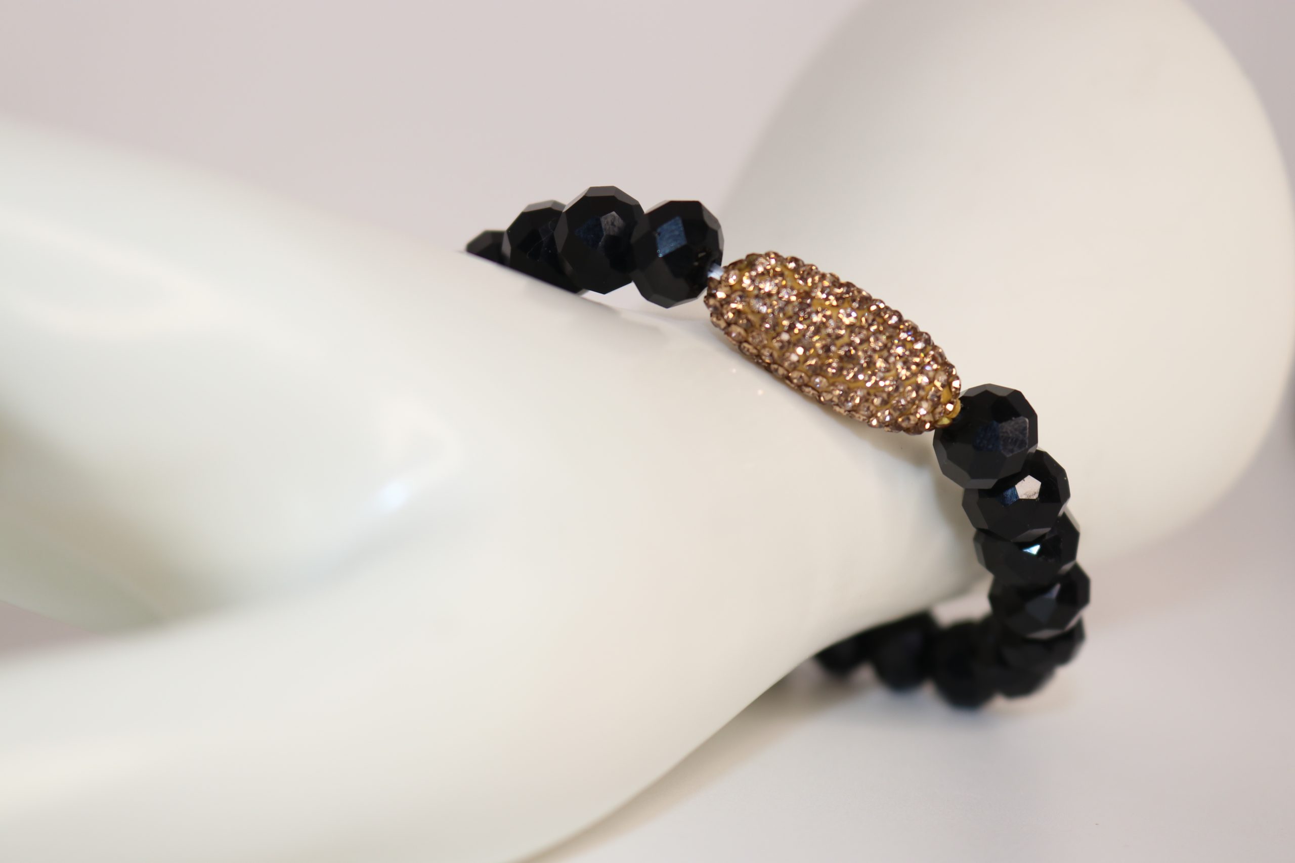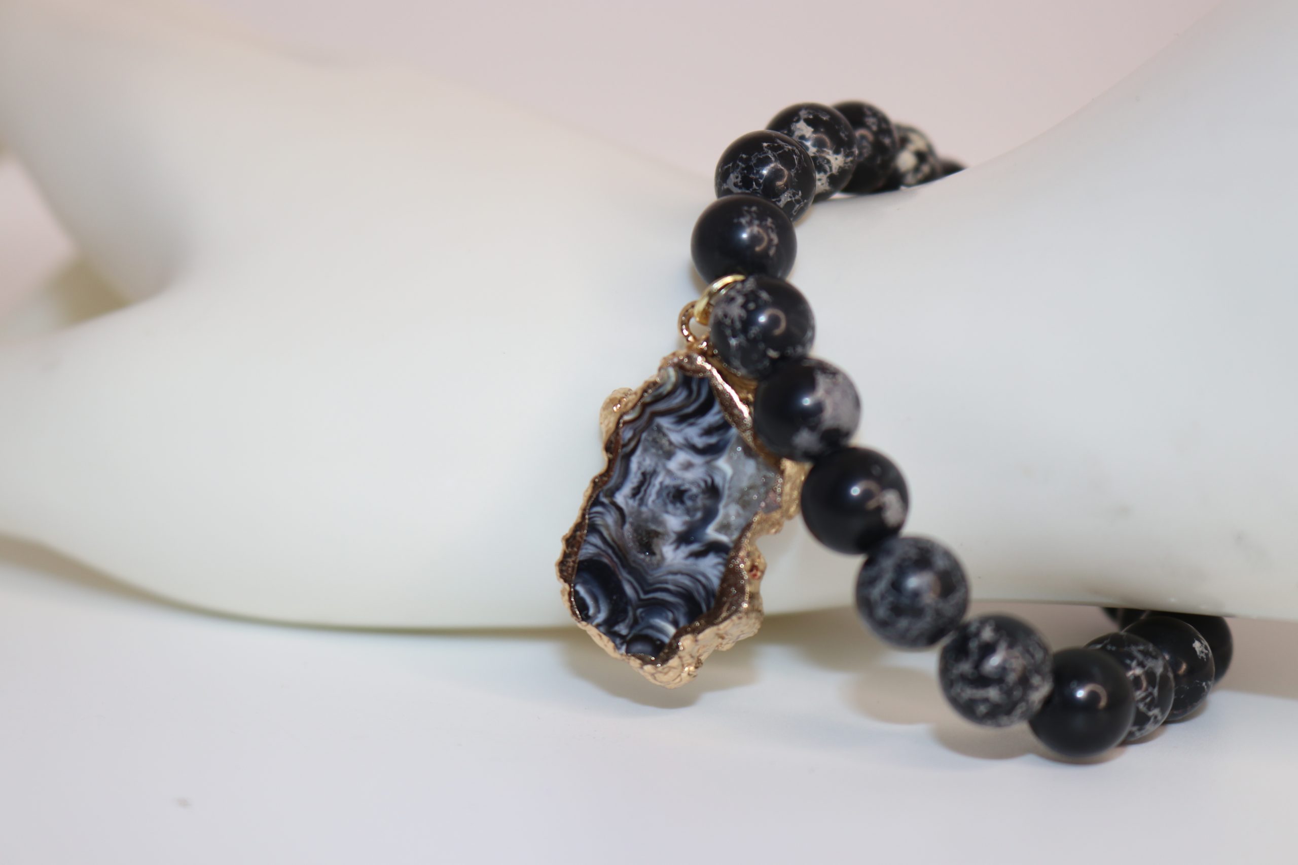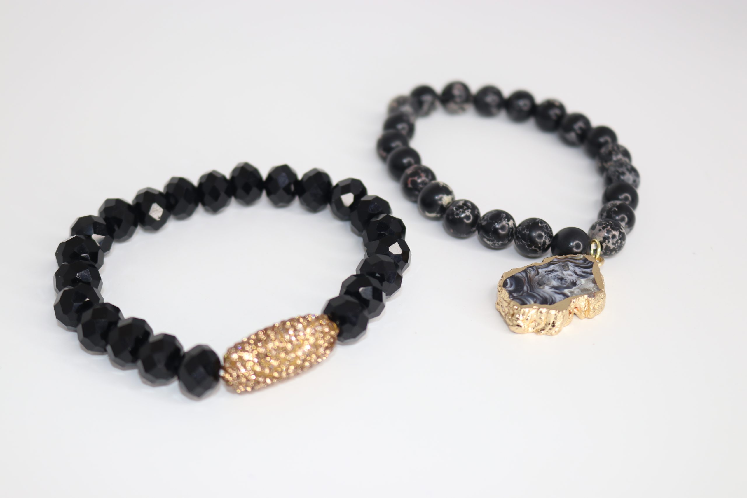 Introducing our “Midnight Obsidian Duo” – A 2-Piece Bracelet Set Step into the enchanting realm of the Midnight Obsidian Duo, a 2-piece bracelet set that seamlessly combines the alluring charm of spotted black obsidian with a touch of golden elegance. This captivating duo features one Spotted Black Obsidian Bracelet with a druzy geode dangling charm and one Black Faceted Bracelet with a sparkling gold centerpiece. **1. Spotted Black Obsidian Bracelet with Druzy Geode Dangling Charm:** *Embrace Protection and Enchantment* At the heart of this mesmerizing set, the Spotted Black Obsidian Bracelet stands as a symbol of protection and balance. Crafted from authentic black obsidian adorned with a captivating druzy geode charm, it offers defense against negativity while promoting emotional equilibrium. The druzy geode, with its sparkling crystals, adds an enchanting touch, reminding you of the hidden beauty that lies within life’s challenges. **2. Black Faceted Bracelet with Gold Sparkling Centerpiece:** *Radiate Elegance and Grace* Complementing the obsidian’s midnight magic is the Black Faceted Bracelet, enhanced by a resplendent gold sparkling centerpiece. This bracelet embodies elegance and grace with its faceted black beads contrasting beautifully against the radiant golden focal point. It’s not just a symbol of sophistication but also a reminder to shine brilliantly, attracting abundance and prosperity into your life. Each bracelet in the Midnight Obsidian Duo tells a unique story of protection, enchantment, and elegance. Together, they create a harmonious blend of style and meaning, elevating your aura and presence to new heights. The Midnight Obsidian Duo invites you to adorn yourself with the mystique of midnight and the elegance of gold, all while harnessing the transformative power of crystals. Whether you choose to wear them separately or as a pair, these bracelets are a testament to the captivating energy they bring into your life.