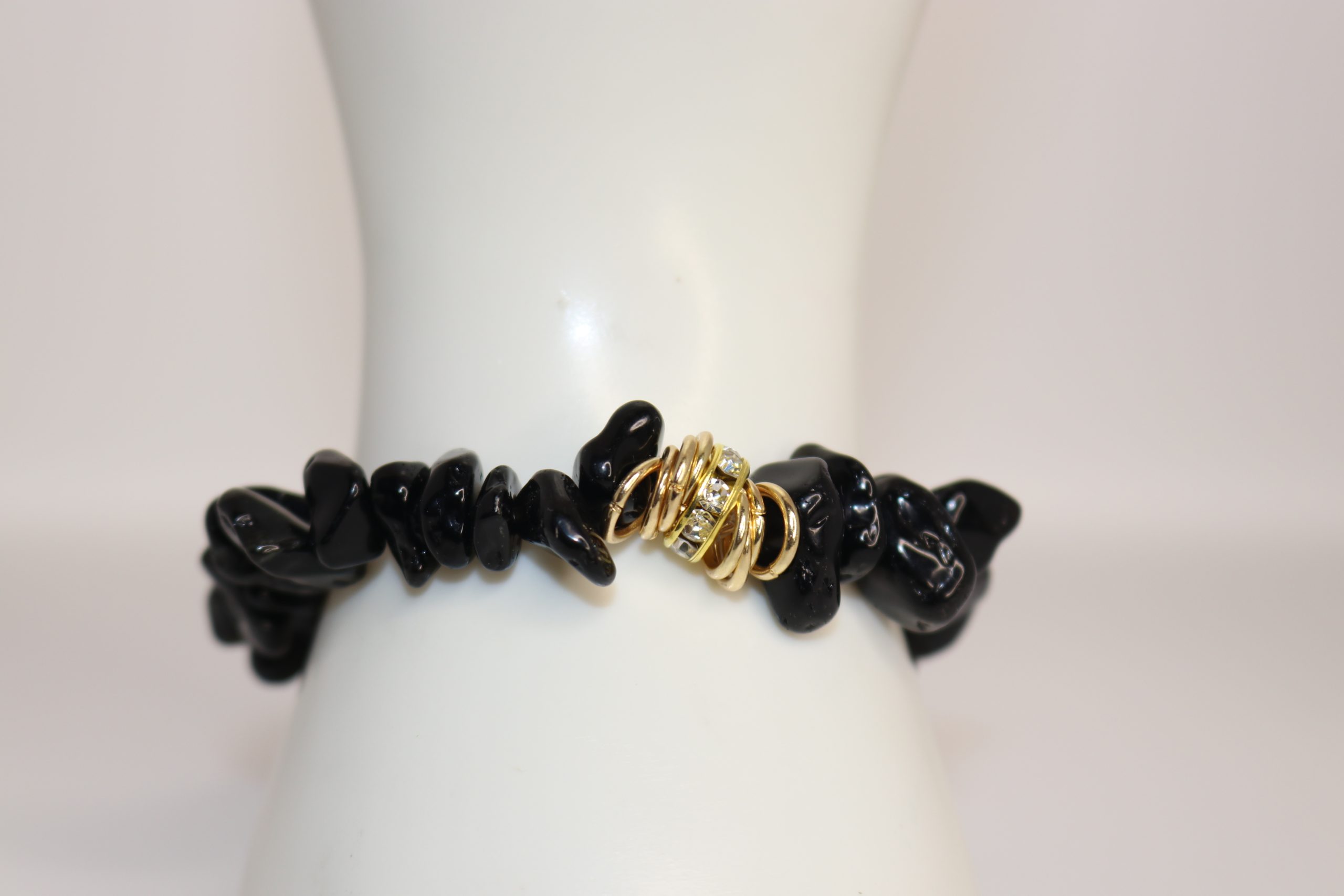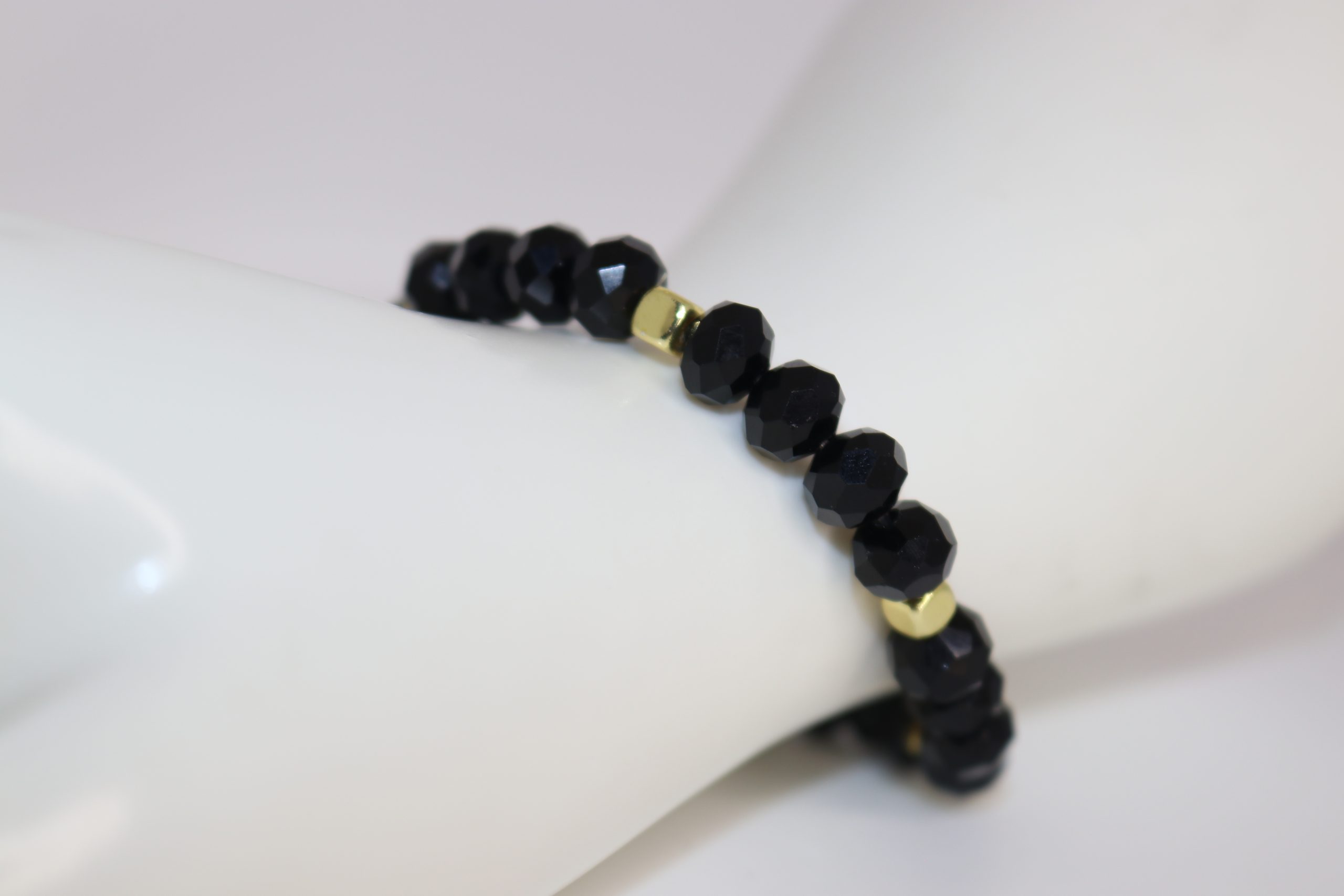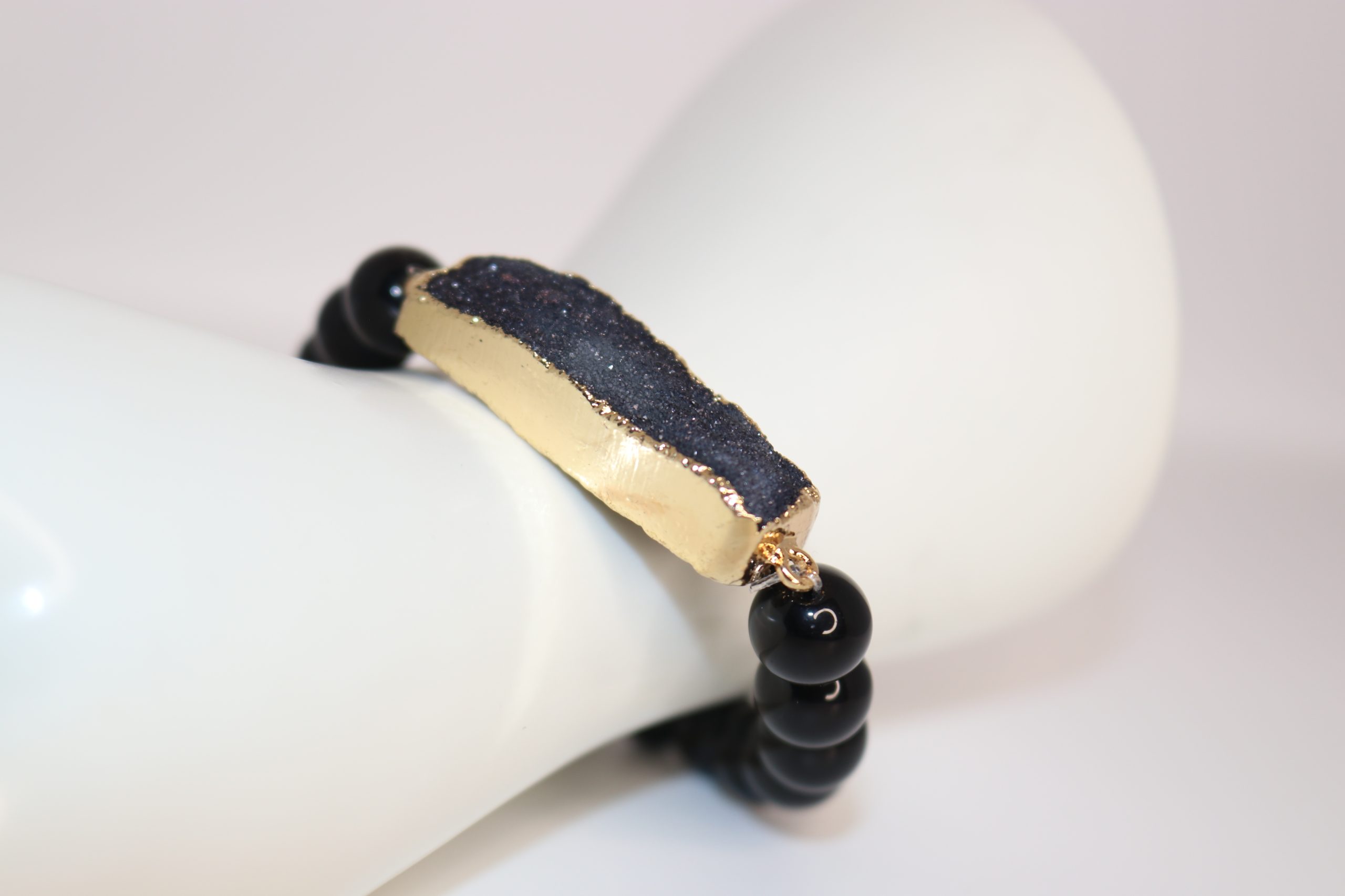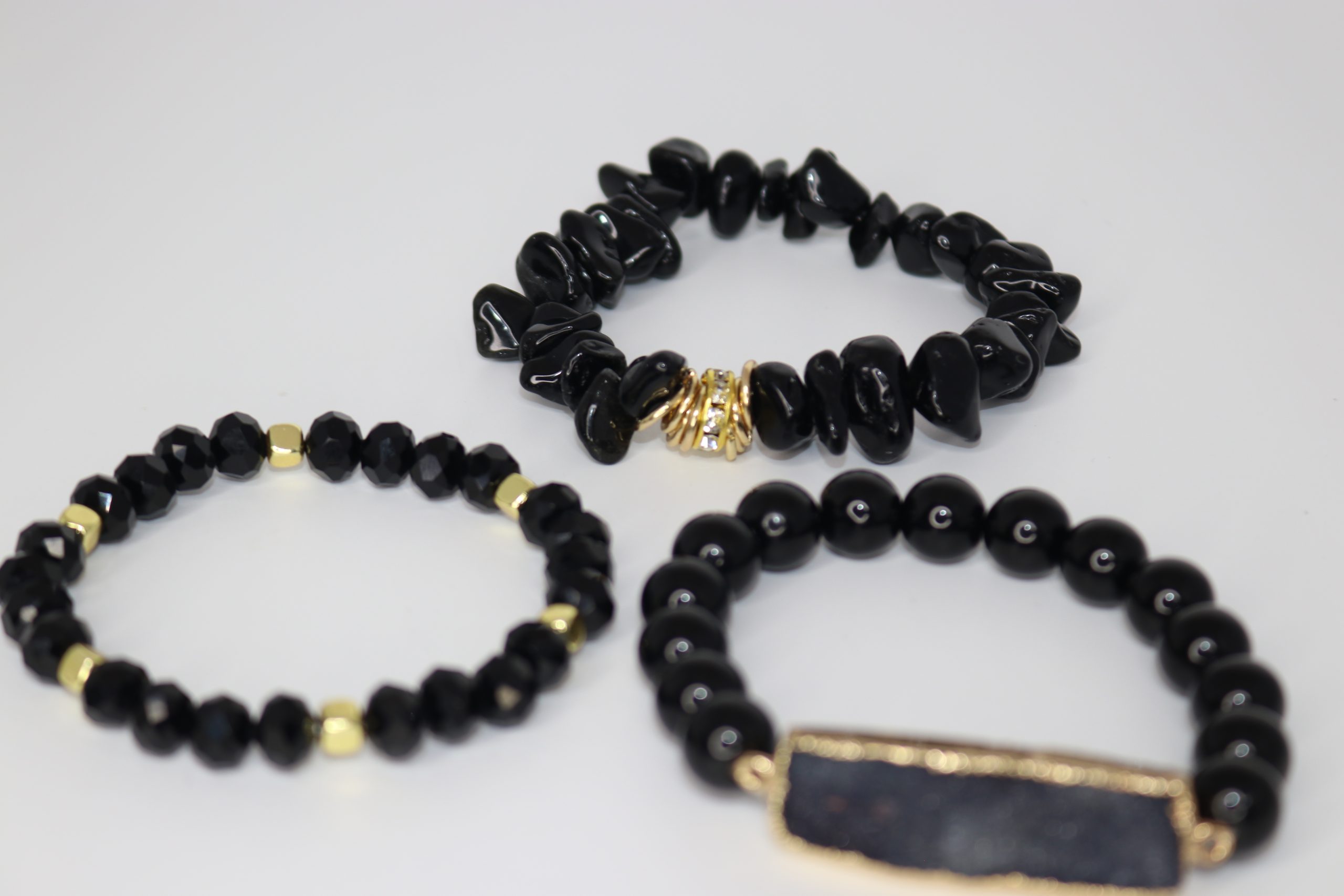Discover the power of crystal energy with our exquisite Midnight Obsidian Trio bracelet set. This carefully curated collection features three unique bracelets, each designed to enhance your life with the captivating essence of black obsidian and the elegance of black and gold faceted beads. 1. **Druzy Black Obsidian Crystal Bracelet:** *Experience Protection and Grounding* At the heart of this set lies our Druzy Black Obsidian Crystal Bracelet. Crafted from genuine black obsidian adorned with sparkling druzy crystals, this bracelet not only exudes sophistication but also carries profound meanings. Black obsidian is renowned for its protective properties, shielding you from negative energies and promoting emotional balance. Its grounding energy will help you stay rooted in the present moment. 2. **Obsidian Chip Crystal Bracelet:** *Embrace Clarity and Healing* The Obsidian Chip Crystal Bracelet complements the set with its natural beauty and healing qualities. This bracelet is a symbol of clarity, helping you confront your inner truths and find resolutions to life’s challenges. It’s a reminder that healing and transformation are possible, even in the darkest of times. 3. **Black & Gold Faceted Bead Bracelet:** *Radiate Elegance and Prosperity* To add a touch of opulence to your wrist, we’ve included the Black & Gold Faceted Bead Bracelet. Its striking combination of black and gold beads symbolizes both sophistication and prosperity. As you wear it, let it remind you to shine brightly and attract abundance into your life. Wear these bracelets individually or together to harness the harmonious energy they collectively bring. Let the deep meanings of black obsidian crystals guide you towards protection, clarity, and elegance in your daily journey. Elevate your style and your spirit with our Harmonious Energy Trio – a set that beautifully blends fashion and crystal heal