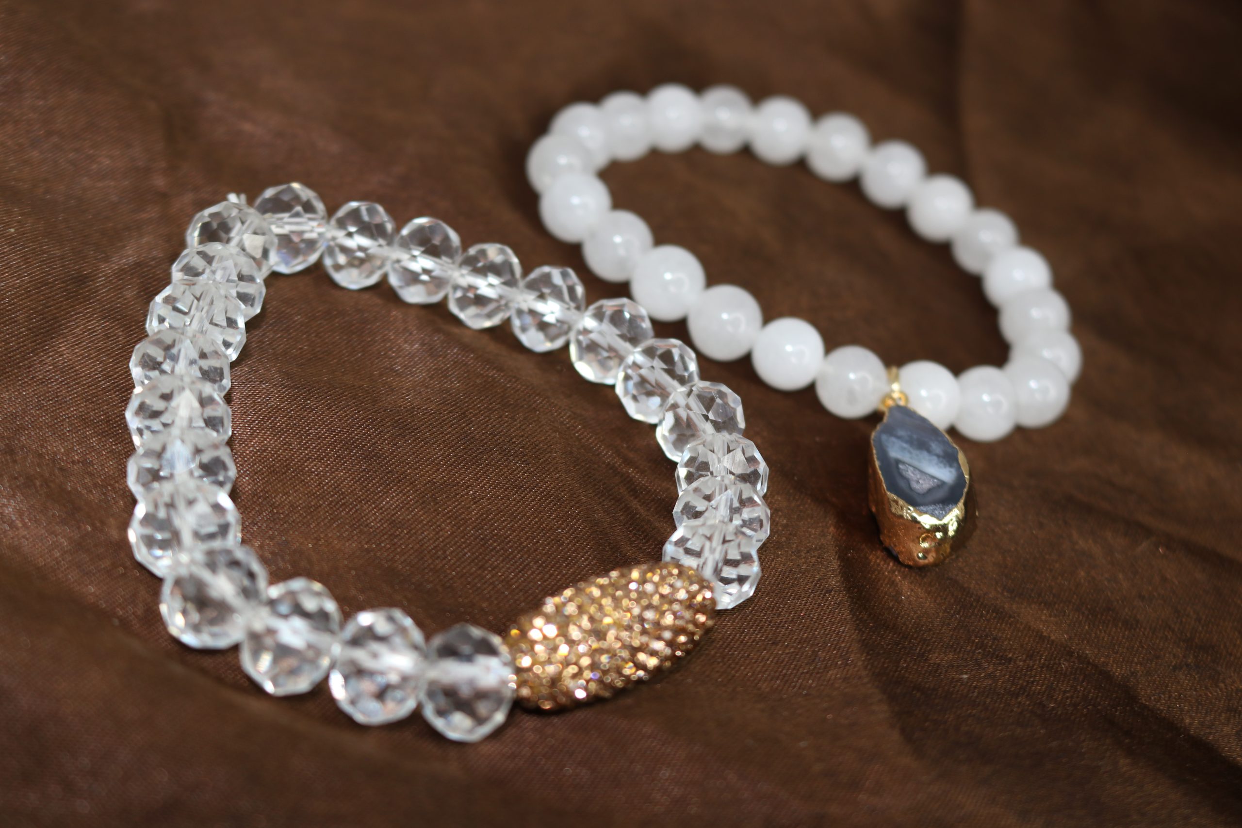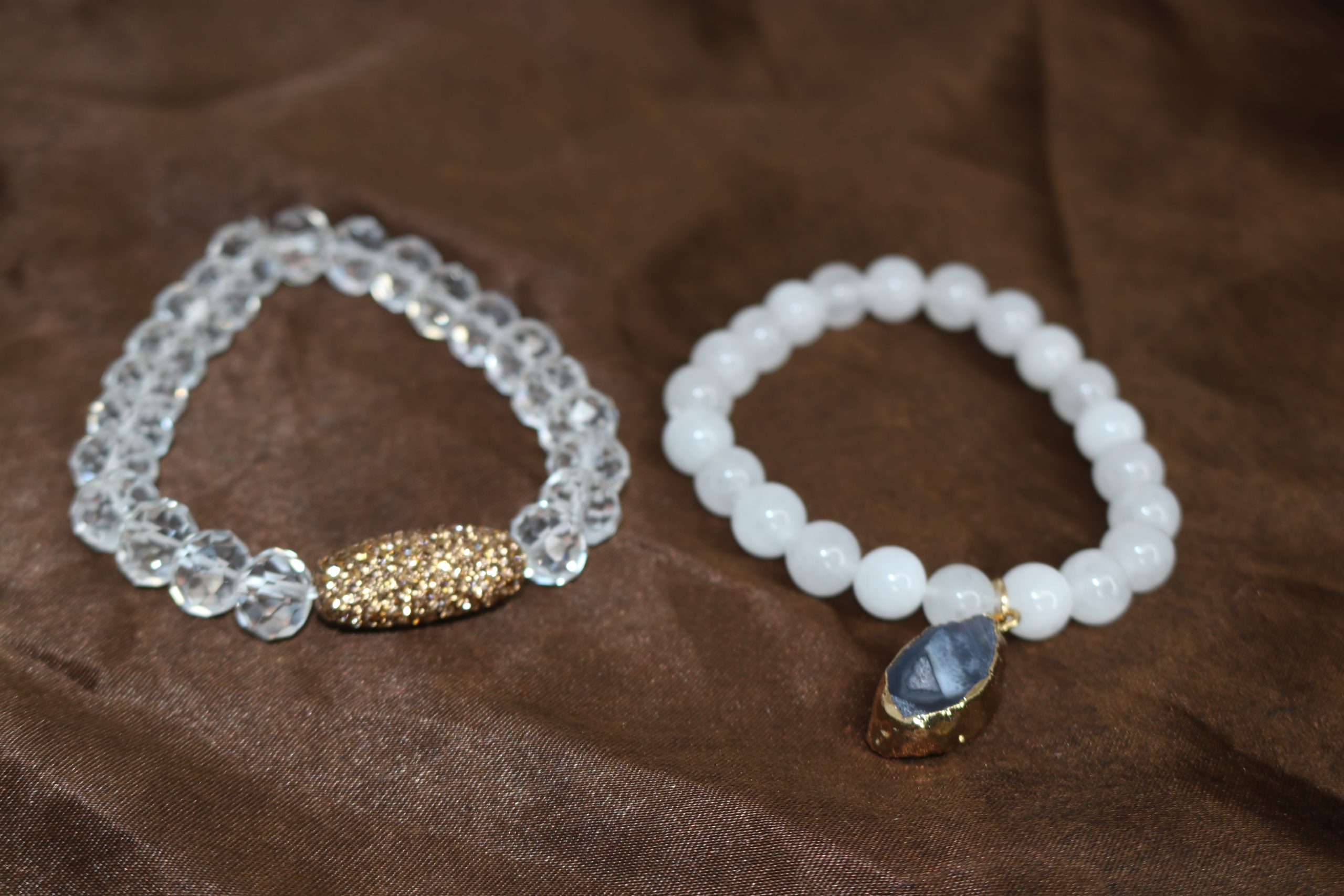 Introducing our “Pure Harmony Duo” – A 2-Piece Bracelet Set Experience the exquisite blend of serenity and sophistication with our Pure Harmony Duo. This thoughtfully crafted 2-piece bracelet set combines the grounding beauty of white marble and the timeless elegance of clear faceted beads, creating a harmonious ensemble that exudes grace and balance. **1. White Marble Bracelet with Round Beads & Druzy Charm:** *Crystal Essence – Grounding and Clarity* At the heart of this captivating duo is our White Marble Bracelet, adorned with smooth round beads and a mesmerizing druzy charm. White marble is celebrated for its grounding properties, helping you find balance and stability in the midst of life’s whirlwinds. As you wear it, allow the calming energy of white marble to connect you to the earth, promoting inner serenity and clarity. **2. Clear Faceted Beads Bracelet with Gold Centerpiece:** *Crystal Essence – Elegance and Brilliance* Complementing the marble’s grounded energy is our Clear Faceted Beads Bracelet, featuring an exquisite gold centerpiece. Clear faceted beads radiate sophistication and timeless elegance. This bracelet symbolizes clarity of purpose and the brilliance of simplicity. It invites you to embrace the beauty of transparency and the clarity it brings to your intentions. Individually, each bracelet in the Pure Harmony Duo possesses unique qualities that promote balance and elegance. Together, they create a harmonious blend of style and crystal energy, elevating your aura and guiding you towards a state of pure harmony and grace. Embrace the serenity. Embrace the elegance. Embrace the duo. Order your Pure Harmony Duo today and experience the perfect fusion of style, symbolism, and crystal essence. Let these bracelets accompany you on a journey towards balance, clarity, and the timeless beauty of simplicity.